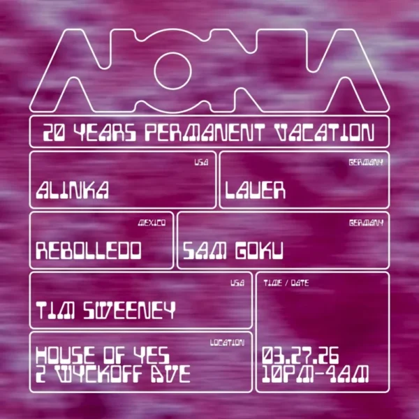 Permanent Vacation will celebrate its 20th anniversary, hosted by  AIONIA,  with a special label night in New York City on Friday, March 27th, 2026. The event will take place at Brooklyn’s House of Yes, running from 10 PM through 4 AM.