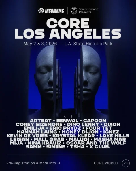 The Los Angeles edition will feature ARTBAT, Benwal, Capoon, Corey Sizemore, Dino Lenny, Dixon, Emilija, Eric Prydz, Four Tet, Hannah Laing, Honey Dijon, Ignez, Kevin de Vries, Krystal Klear, Lake Hills, Leisan, Mall Grab, Malugi, Masha Mar, Mija, Nina Kraviz, Oscar and the Wolf, Samm, SIM0NE, TSHA, and X Club. The lineup reflects CORE’s focus on both established figures and contemporary artists across house and techno.
