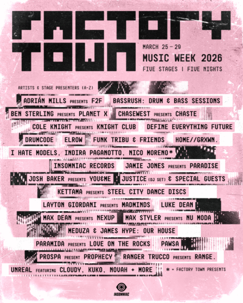 Insomniac has unveiled the day-by-day programming for Factory Town’s five-night Miami Music Week 2026 takeover, running March 25–29. Across five stages—Infinity Room, The Park, The Warehouse, The Chain Room, and Cypress End—the event brings a stacked mix of house, techno, drum & bass, and genre-blurring underground sounds to Miami’s raw nightlife district.