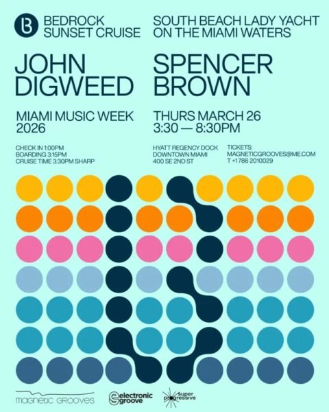 John Digweed will showcase the imprint’s sound alongside Spencer Brown; both artists will headline the Bedrock Cruise on March 26th, 2026, during Miami Music Week. Organized by Magnetic Grooves and set aboard the South Beach Lady, the event will transform Biscayne Bay into a moving dance floor framed by the Miami skyline, offering a focused alternative to the week’s marathon club nights.  Grab your tickets here.