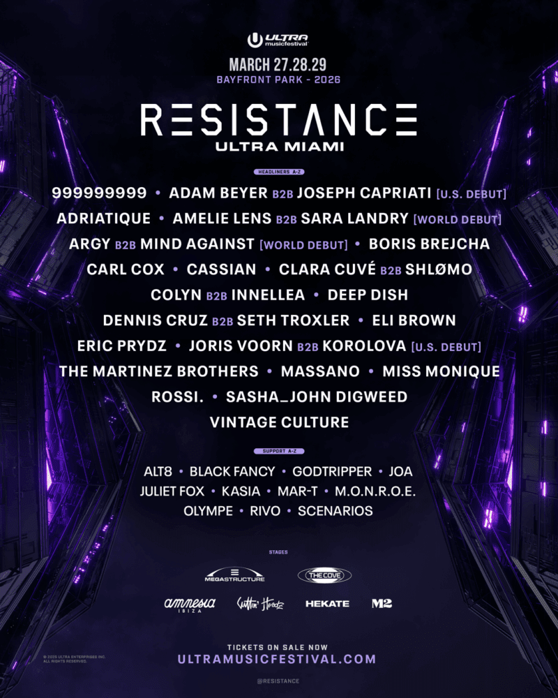 Ultra Music Festival has confirmed the RESISTANCE program for its 26th edition, taking place from March 27th to 29th, 2026, at Bayfront Park in Downtown Miami. The underground brand returns to the MegaStructure and The Cove with a lineup built around rare pairings, debuts, and established names.